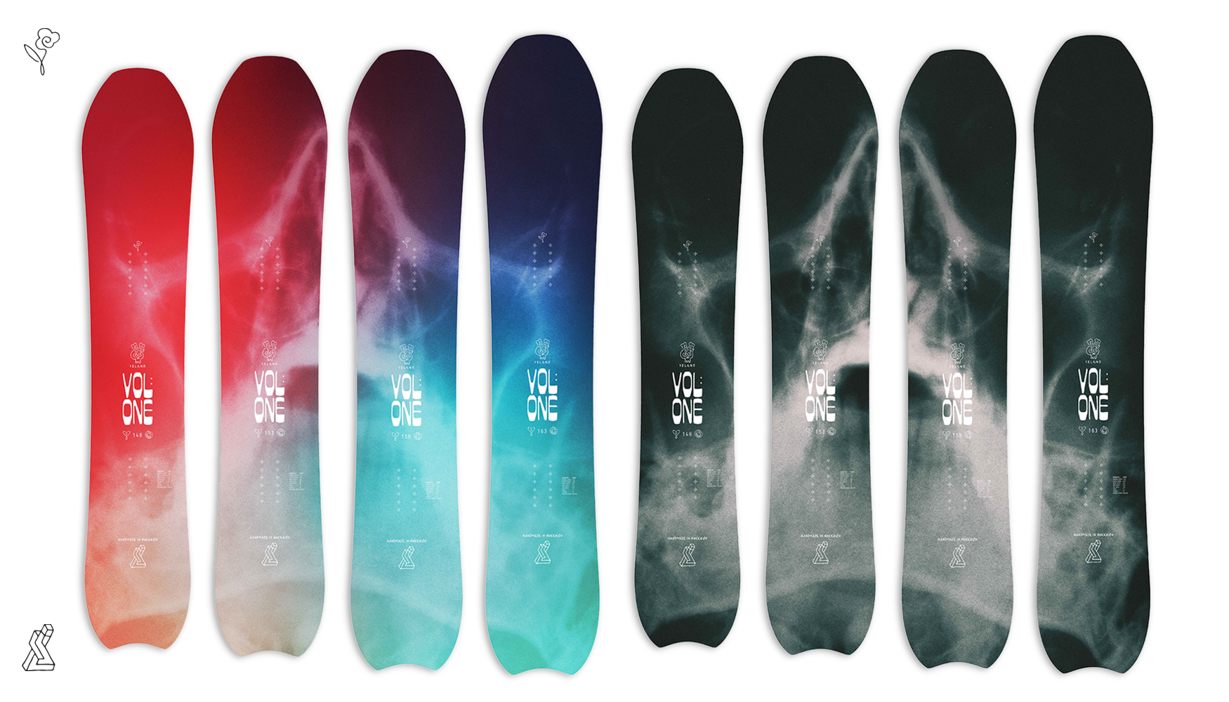 My graphic uses an old x-ray of my skull taken during the winter season of 2002 while I was living in Meribel, France. The image is split across the 4 lengths in the range and comes in a psychedelic colour version or a monotone version. A custom ‘Vol:One’ logotype and hand-drawn graphic icons referencing the cycles of life & death, love, growth and renewal complete the design.
